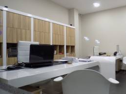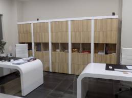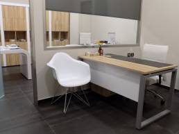 The furniture consists of Orbis One desks in white glossy lacquer and bookshelves and accessories in natural oak. The secretary’s office is from the PRISMA collection with a metal frame. Great color combinations in a perfectly professional space.