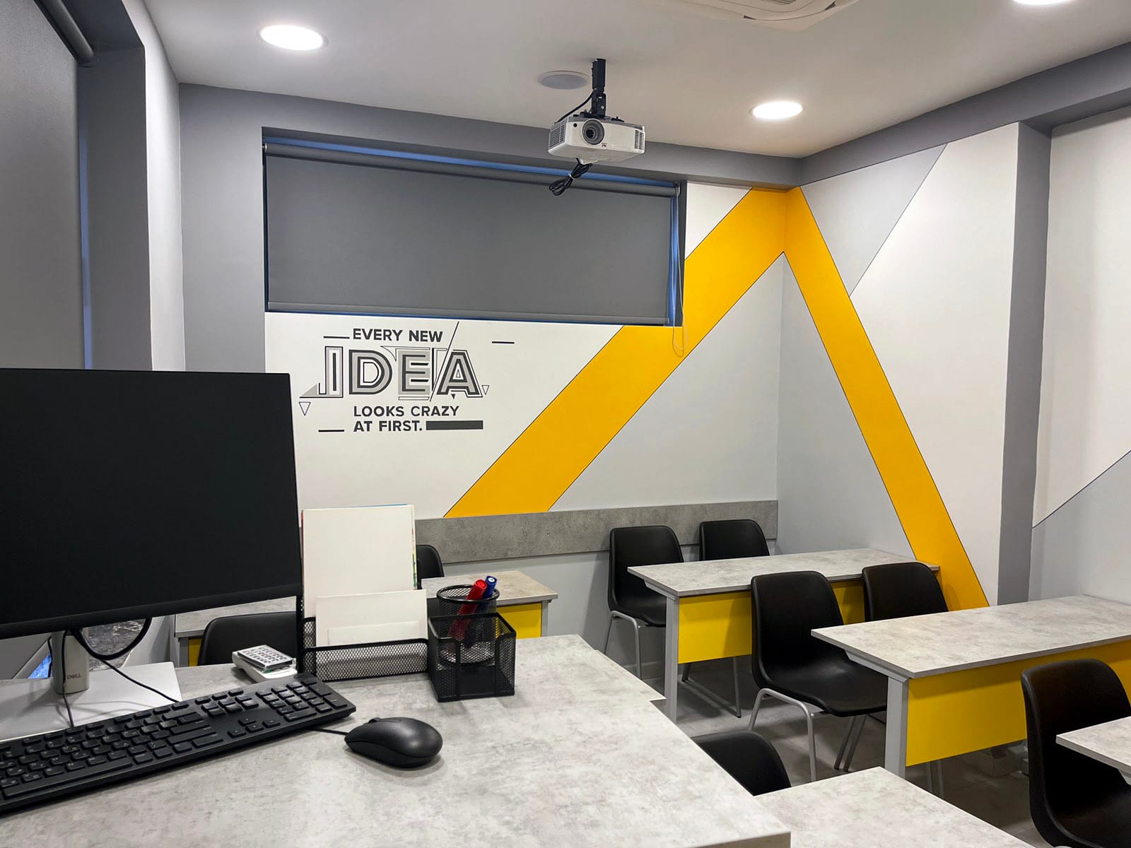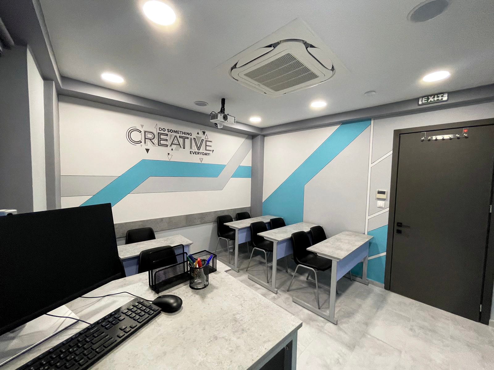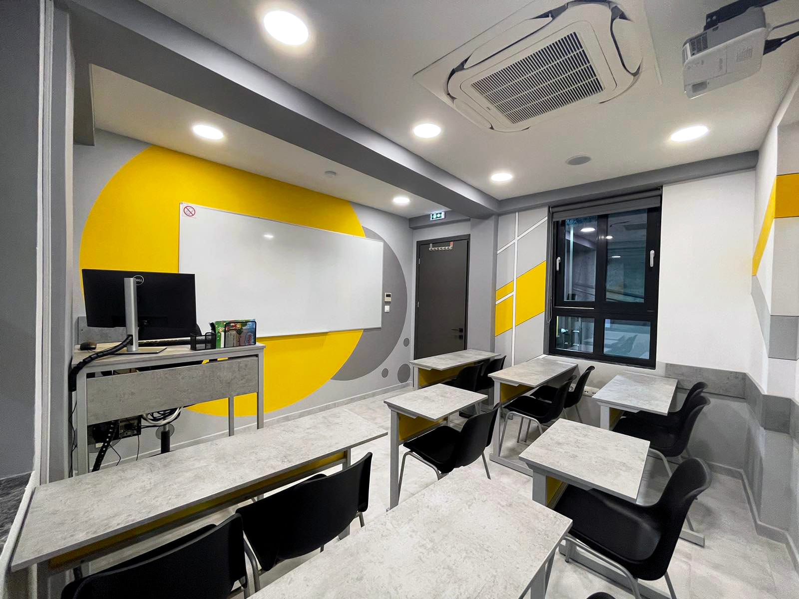 Στο ίδιο μοντέρνο ύφος συνεχίστηκε και η επίπλωση στις αίθουσες διδασκαλίας. Όπου για εκεί συνδυάσαμε αποχρώσεις τσιμέντου στις επιφάνειες εργασίας με έντονα και ζωηρά χρώματα στις μετώπες των γραφείων.